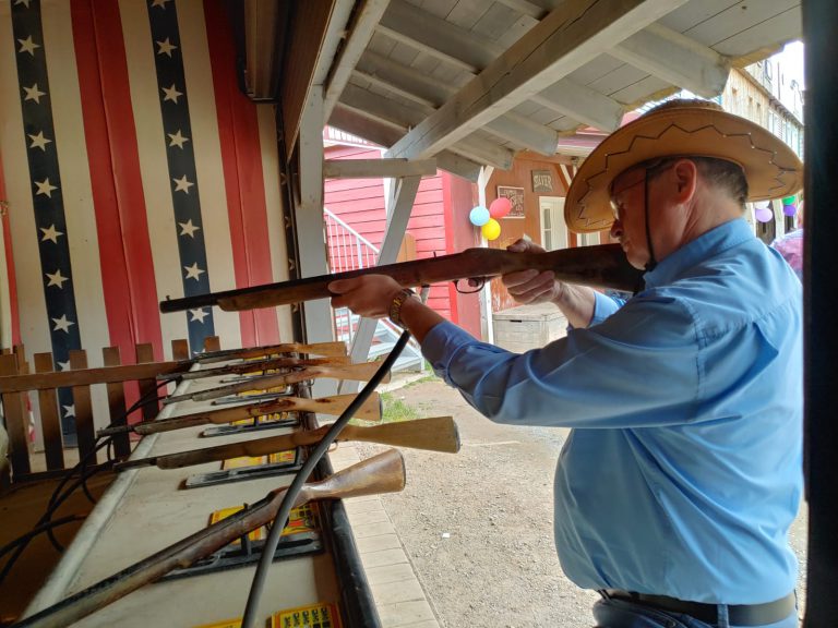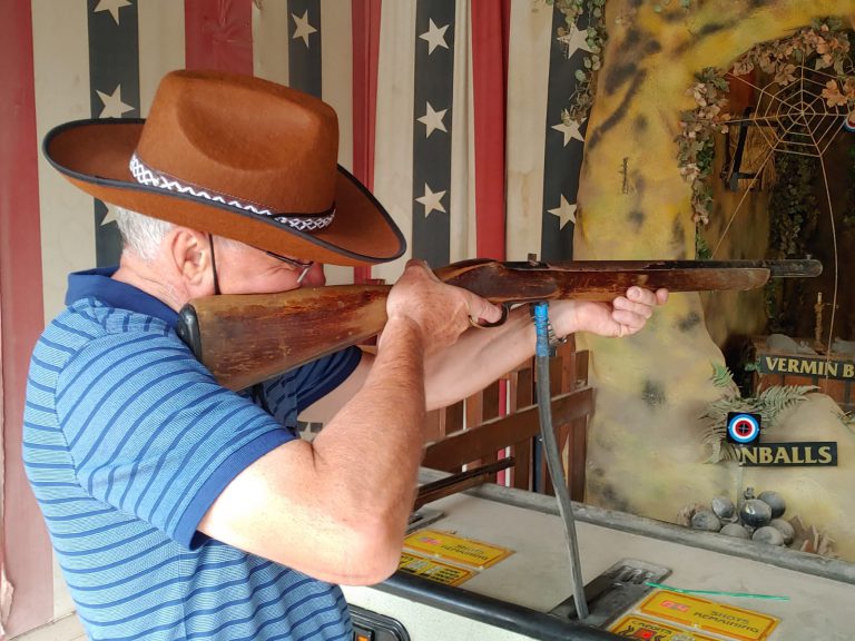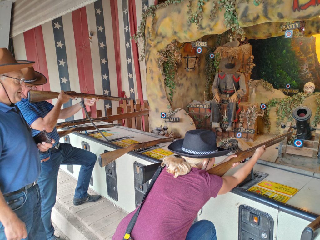Gemütlicher Bummel durch die verschiedenen stores, es gab allerlei Knarren und sonstiges, was dem Westmann(Frau) das Überleben sichert. Dazu gehörte selbstverständlich auch der Büffelbraten, allerdings in Form von Schnitzel und Pommes oder trivialer Currywurst.